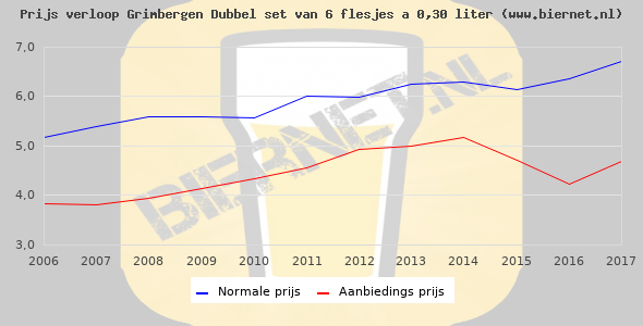 De gemiddelde prijs van een set van 6 flesjes á 0,30 liter van Grimbergen Dubbel is €8,28 (€4,6 per liter). De gemiddelde prijs van Grimbergen Dubbel in de winkel is €4,31 per liter.