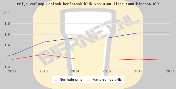 De gemiddelde prijs van een blik van 0,50 liter van Grolsch Herfstbok is €2,19 (€4,38 per liter). De gemiddelde prijs van Grolsch Herfstbok in de winkel is €4,03 per liter.
