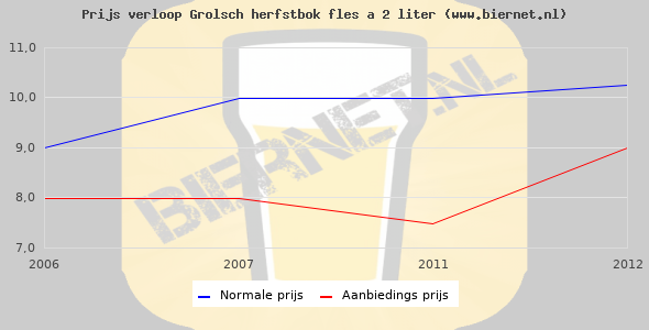 De gemiddelde prijs van een fles á 2 liter van Grolsch Herfstbok is niet bekend. De gemiddelde prijs van Grolsch Herfstbok in de winkel is niet bekend.
