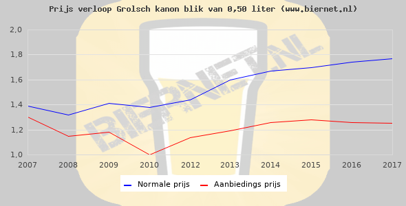 De gemiddelde prijs van een blik van 0,50 liter van Grolsch kanon is €2,47 (€4,94 per liter). De gemiddelde prijs van Grolsch kanon in de winkel is €4,95 per liter.