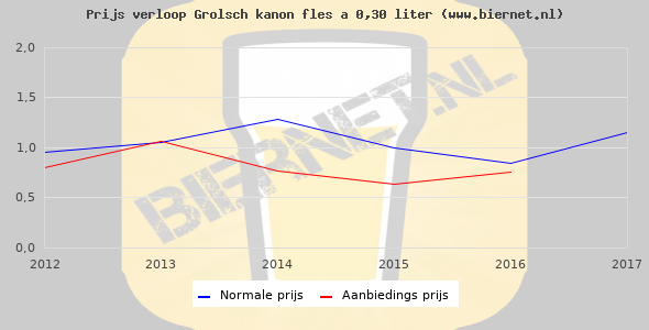 De gemiddelde prijs van een fles á 0,30 liter van Grolsch kanon is €1,61 (€5,37 per liter). De gemiddelde prijs van Grolsch kanon in de winkel is €4,95 per liter.