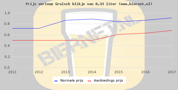 De gemiddelde prijs van een blikje van 0,33 liter van Grolsch Premium Pilsner is €1,26 (€3,82 per liter). De gemiddelde prijs van Grolsch Premium Pilsner in de winkel is €2,81 per liter.