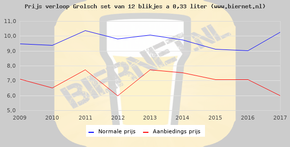 De gemiddelde prijs van een set van 12 blikjes á 0,33 liter van Grolsch Premium Pilsner is €8,49 (€2,14 per liter). De gemiddelde prijs van Grolsch Premium Pilsner in de winkel is €2,81 per liter.