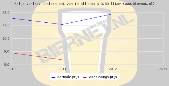 De gemiddelde prijs van een set van 12 blikken á 0,50 liter van Grolsch Premium Pilsner is niet bekend. De gemiddelde prijs van Grolsch Premium Pilsner in de winkel is niet bekend.