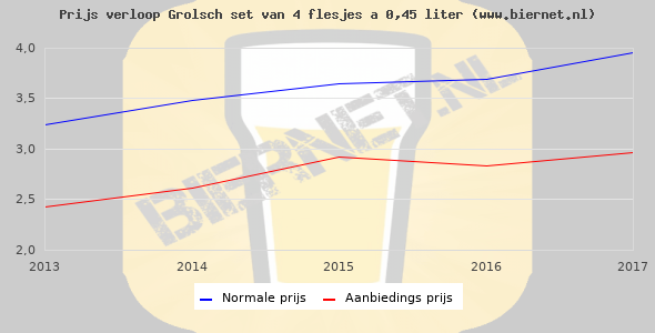De gemiddelde prijs van een set van 4 flesjes á 0,45 liter van Grolsch Premium Pilsner is €5,02 (€2,79 per liter). De gemiddelde prijs van Grolsch Premium Pilsner in de winkel is €2,81 per liter.