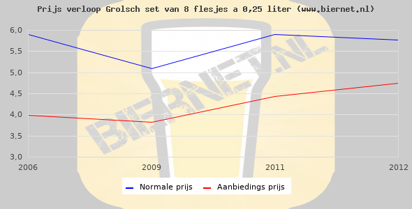 De gemiddelde prijs van een set van 8 flesjes á 0,25 liter van Grolsch Premium Pilsner is niet bekend. De gemiddelde prijs van Grolsch Premium Pilsner in de winkel is niet bekend.