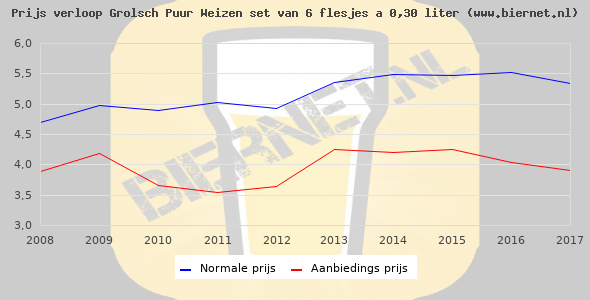 De gemiddelde prijs van een set van 6 flesjes á 0,30 liter van Grolsch Puur Weizen is €7,54 (€4,19 per liter). De gemiddelde prijs van Grolsch Puur Weizen in de winkel is €4,22 per liter.
