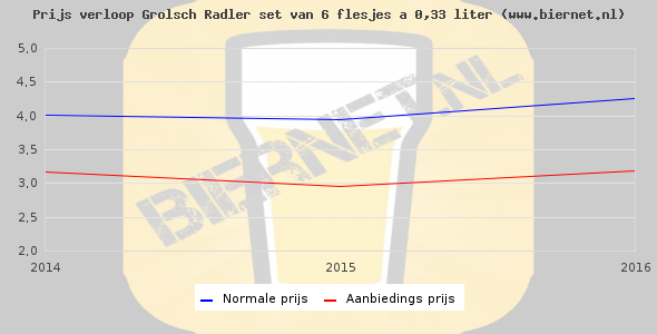 De gemiddelde prijs van een set van 6 flesjes á 0,33 liter van Grolsch Radler Citroen is niet bekend. De gemiddelde prijs van Grolsch Radler Citroen in de winkel is niet bekend.