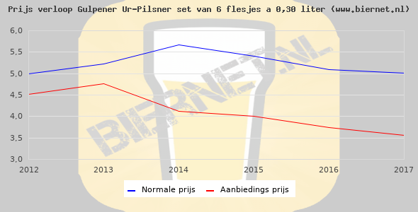 De gemiddelde prijs van een set van 6 flesjes á 0,30 liter van Gulpener Biologisch Pilsner is €6,92 (€3,84 per liter). De gemiddelde prijs van Gulpener Biologisch Pilsner in de winkel is €3,82 per liter.