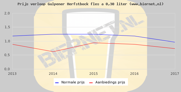 De gemiddelde prijs van een fles á 0,30 liter van Gulpener Herfstbock is €2,05 (€6,83 per liter). De gemiddelde prijs van Gulpener Herfstbock in de winkel is €4,11 per liter.