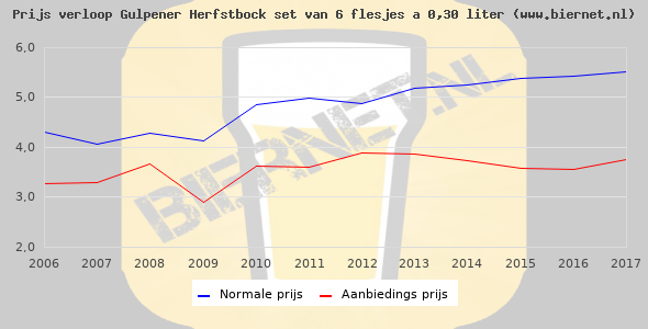 De gemiddelde prijs van een set van 6 flesjes á 0,30 liter van Gulpener Herfstbock is €7,09 (€3,94 per liter). De gemiddelde prijs van Gulpener Herfstbock in de winkel is €4,11 per liter.