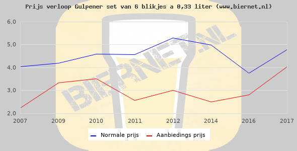 De gemiddelde prijs van een set van 6 blikjes 0,33 liter van Gulpener Pilsner is niet bekend. De gemiddelde prijs van Gulpener Pilsner in de winkel is niet bekend.