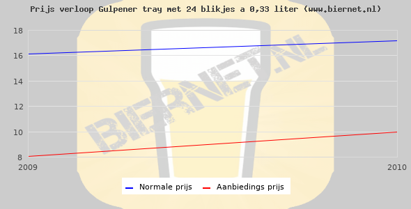 De gemiddelde prijs van een tray met 24 blikjes 0,33 liter van Gulpener Pilsner is niet bekend. De gemiddelde prijs van Gulpener Pilsner in de winkel is niet bekend.