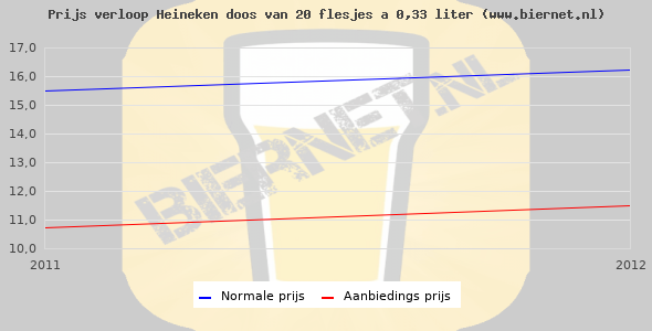 De gemiddelde prijs van een doos van 20 flesjes á 0,33 liter van Heineken Pilsener is niet bekend. De gemiddelde prijs van Heineken Pilsener in de winkel is niet bekend.
