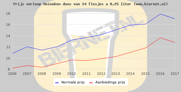 De gemiddelde prijs van een doos van 24 flesjes á 0,25 liter van Heineken Pilsener is €22,99 (€3,83 per liter). De gemiddelde prijs van Heineken Pilsener in de winkel is €3,19 per liter.