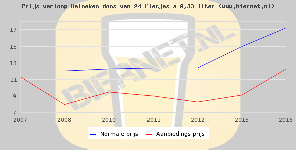 De gemiddelde prijs van een doos van 24 flesjes á 0,33 liter van Heineken Pilsener is niet bekend. De gemiddelde prijs van Heineken Pilsener in de winkel is niet bekend.