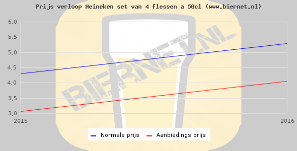 De gemiddelde prijs van een set van 4 flessen a 50cl van Heineken Pilsener is niet bekend. De gemiddelde prijs van Heineken Pilsener in de winkel is niet bekend.