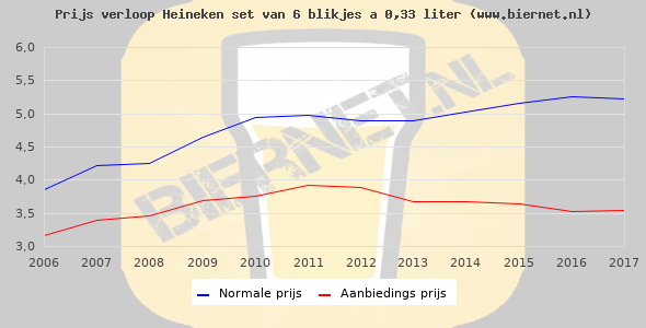 De gemiddelde prijs van een set van 6 blikjes 0,33 liter van Heineken Pilsener is €6,59 (€3,33 per liter). De gemiddelde prijs van Heineken Pilsener in de winkel is €3,19 per liter.