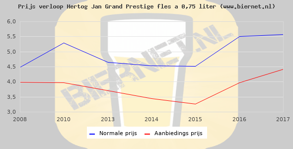 De gemiddelde prijs van een fles á 0,75 liter van Hertog Jan Grand Prestige is €6,92 (€9,23 per liter). De gemiddelde prijs van Hertog Jan Grand Prestige in de winkel is €6,39 per liter.