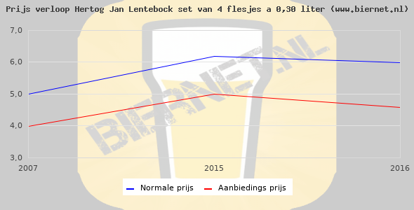 De gemiddelde prijs van een set van 4 flesjes á 0,30 liter van Hertog Jan Lentebock is niet bekend. De gemiddelde prijs van Hertog Jan Lentebock in de winkel is niet bekend.