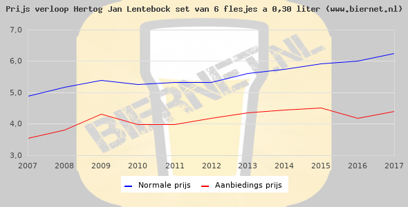 De gemiddelde prijs van een set van 6 flesjes á 0,30 liter van Hertog Jan Lentebock is €8,59 (€4,77 per liter). De gemiddelde prijs van Hertog Jan Lentebock in de winkel is €4,67 per liter.