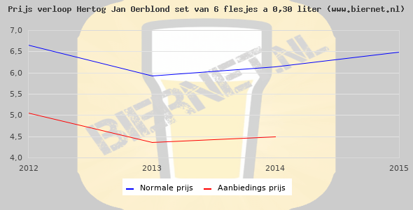 De gemiddelde prijs van een set van 6 flesjes á 0,30 liter van Hertog Jan Oerblond is niet bekend. De gemiddelde prijs van Hertog Jan Oerblond in de winkel is niet bekend.