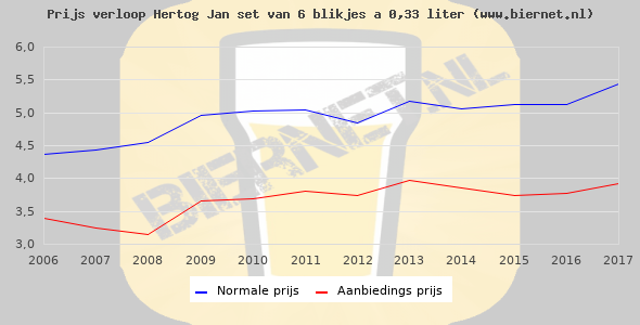 De gemiddelde prijs van een set van 6 blikjes 0,33 liter van Hertog Jan Pilsener is €6,99 (€3,53 per liter). De gemiddelde prijs van Hertog Jan Pilsener in de winkel is €3,03 per liter.