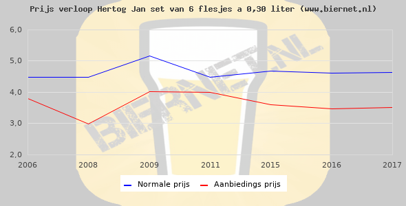 De gemiddelde prijs van een set van 6 flesjes á 0,30 liter van Hertog Jan Pilsener is €6,27 (€3,48 per liter). De gemiddelde prijs van Hertog Jan Pilsener in de winkel is €3,03 per liter.