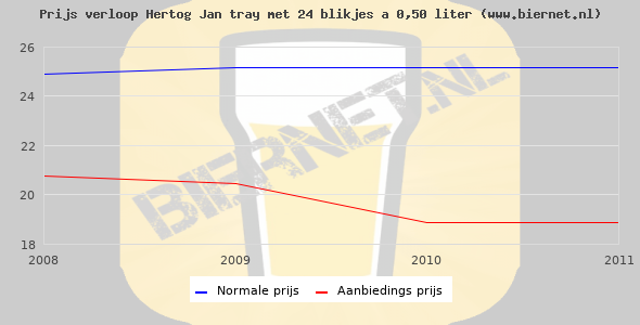 De gemiddelde prijs van een tray met 24 blikjes 0,50 liter van Hertog Jan Pilsener is niet bekend. De gemiddelde prijs van Hertog Jan Pilsener in de winkel is niet bekend.
