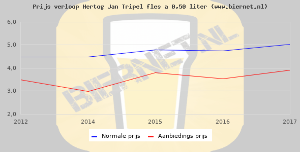 De gemiddelde prijs van een fles á 0,50 liter van Hertog Jan Tripel is €8,07 (€16,14 per liter). De gemiddelde prijs van Hertog Jan Tripel in de winkel is €5,48 per liter.