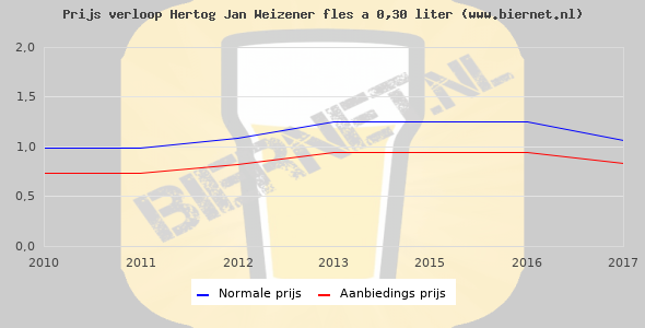 De gemiddelde prijs van een fles á 0,30 liter van Hertog Jan Weizener is €1,45 (€4,83 per liter). De gemiddelde prijs van Hertog Jan Weizener in de winkel is €4,28 per liter.