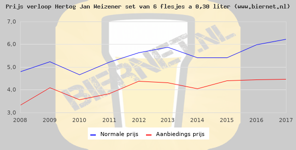 De gemiddelde prijs van een set van 6 flesjes á 0,30 liter van Hertog Jan Weizener is €7,92 (€4,4 per liter). De gemiddelde prijs van Hertog Jan Weizener in de winkel is €4,28 per liter.