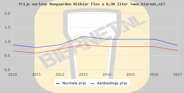 De gemiddelde prijs van een fles á 0,30 liter van Hoegaarden Witbier is €1,39 (€4,63 per liter). De gemiddelde prijs van Hoegaarden Witbier in de winkel is €4,34 per liter.