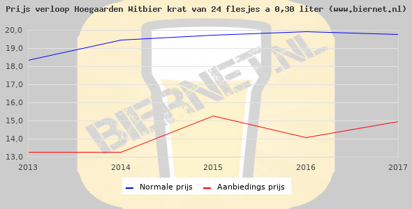 De gemiddelde prijs van een krat van 24 flesjes á 0,30 liter van Hoegaarden Witbier is niet bekend. De gemiddelde prijs van Hoegaarden Witbier in de winkel is niet bekend.