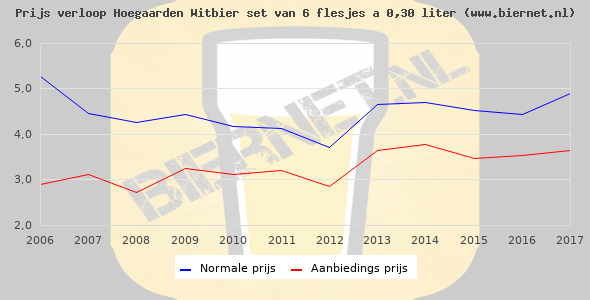 Hieronder staan de standaard prijzen van een Hoegaarden Witbier set van 6 flesjes á 0,30 liter. Op dit moment zijn er 2 aanbiedingen van Hoegaarden Witbier.