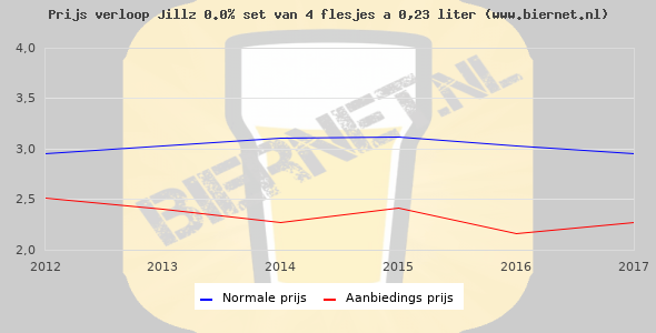 De gemiddelde prijs van een set van 4 flesjes á 0,23 liter van Jillz 0.0% is niet bekend. De gemiddelde prijs van Jillz 0.0% in de winkel is niet bekend.