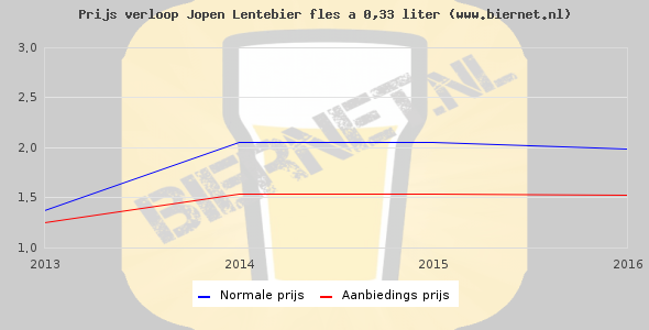 De gemiddelde prijs van een fles á 0,33 liter van Jopen Lentebier is niet bekend. De gemiddelde prijs van Jopen Lentebier in de winkel is niet bekend.
