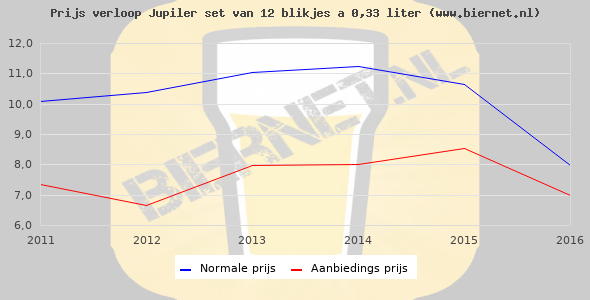 De gemiddelde prijs van een set van 12 blikjes á 0,33 liter van Jupiler Pils is niet bekend. De gemiddelde prijs van Jupiler Pils in de winkel is niet bekend.