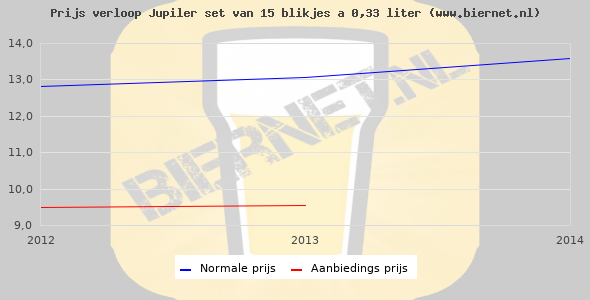 De gemiddelde prijs van een set van 15 blikjes á 0,33 liter van Jupiler Pils is niet bekend. De gemiddelde prijs van Jupiler Pils in de winkel is niet bekend.