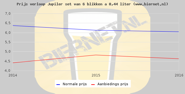 De gemiddelde prijs van een set van 6 blikken á 0,44 liter van Jupiler Pils is €10,37 (€3,93 per liter). De gemiddelde prijs van Jupiler Pils in de winkel is €3,48 per liter.