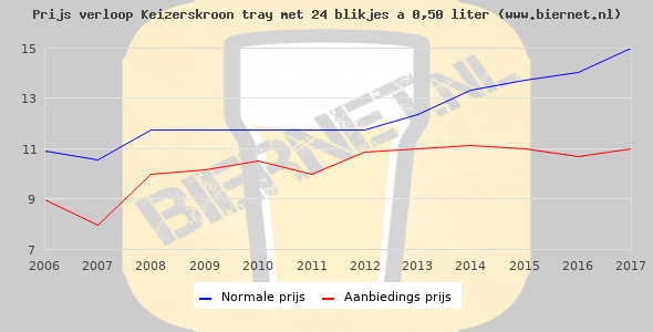 De gemiddelde prijs van een tray met 24 blikjes 0,50 liter van Keizerskroon is niet bekend. De gemiddelde prijs van Keizerskroon in de winkel is niet bekend.
