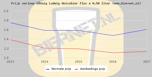 De gemiddelde prijs van een fles á 0,50 liter van König Ludwig Weissbier is €2,2 (€4,4 per liter). De gemiddelde prijs van König Ludwig Weissbier in de winkel is €3,68 per liter.