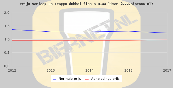 De gemiddelde prijs van een fles á 0,33 liter van La Trappe Dubbel is €2,1 (€6,36 per liter). De gemiddelde prijs van La Trappe Dubbel in de winkel is €6,02 per liter.