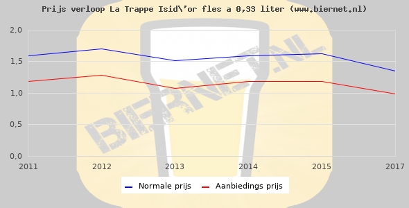 De gemiddelde prijs van een fles á 0,33 liter van La Trappe Isid'or is €2,23 (€6,76 per liter). De gemiddelde prijs van La Trappe Isid'or in de winkel is €6,62 per liter.