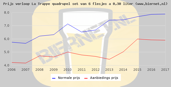 De gemiddelde prijs van een set van 6 flesjes á 0,30 liter van La Trappe Quadrupel is niet bekend. De gemiddelde prijs van La Trappe Quadrupel in de winkel is niet bekend.