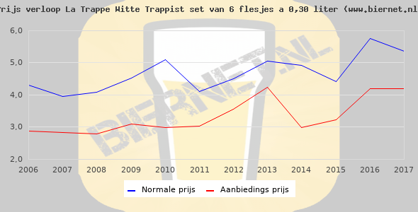 De gemiddelde prijs van een set van 6 flesjes á 0,30 liter van La Trappe Witte Trappist is niet bekend. De gemiddelde prijs van La Trappe Witte Trappist in de winkel is niet bekend.