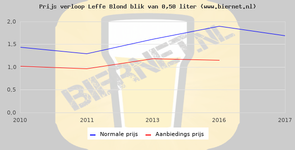 De gemiddelde prijs van een blik van 0,50 liter van Leffe Blond is €2,25 (€4,5 per liter). De gemiddelde prijs van Leffe Blond in de winkel is €4,59 per liter.