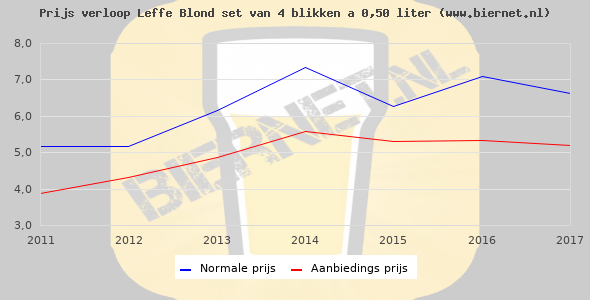 De gemiddelde prijs van een set van 4 blikken á 0,50 liter van Leffe Blond is €8,71 (€4,36 per liter). De gemiddelde prijs van Leffe Blond in de winkel is €4,59 per liter.