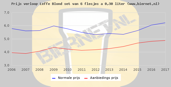 De gemiddelde prijs van een set van 6 flesjes á 0,30 liter van Leffe Blond is €8,65 (€4,81 per liter). De gemiddelde prijs van Leffe Blond in de winkel is €4,59 per liter.