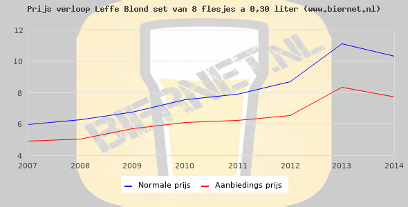 De gemiddelde prijs van een set van 8 flesjes á 0,30 liter van Leffe Blond is niet bekend. De gemiddelde prijs van Leffe Blond in de winkel is niet bekend.